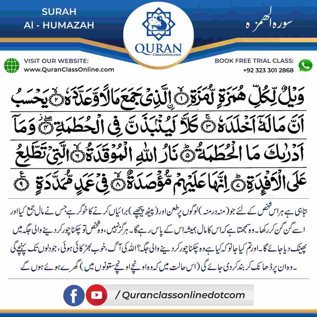 Surah -Al-Humazah is a Quranic Surah which means (The Slanderer)
