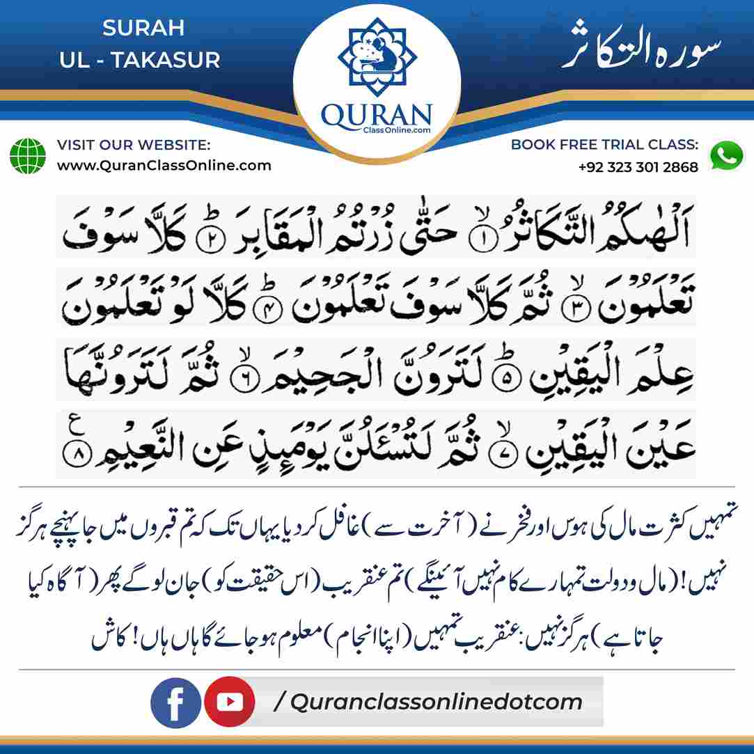 7 SURAH -UL TAKASURSURAH -UL TAKASUR is a Quranic Surah which means ( The Abundance of wealth)